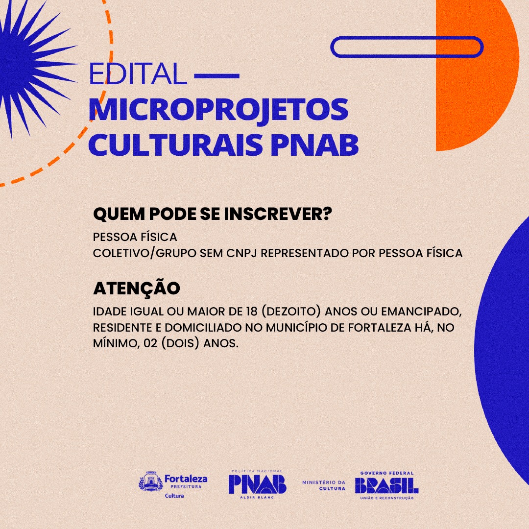 PODE SE INSCREVER NO EDITAL QUALQUER AGENTE CULTURAL, PESSOA FÍSICA, COM IDADE IGUAL OU MAIOR DE 18 (DEZOITO) ANOS, OU EMANCIPADO, RESIDENTE E DOMICILIADO(A) NO MUNICÍPIO DE FORTALEZA HÁ, NO MÍNIMO, 02 (DOIS) ANOS.