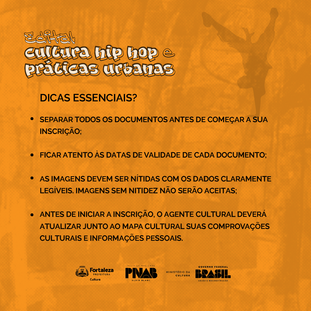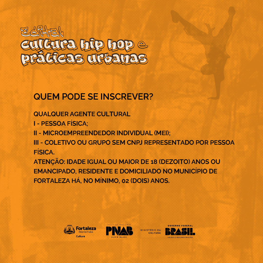 A Prefeitura de Fortaleza lança, por meio da Secretaria Municipal da Cultura de Fortaleza (Secultfor), o Edital de Cultura Hip Hop e Práticas Urbanas - Política Nacional Aldir Blanc de Fomento à Cultura (PNAB). As inscrições devem ser realizadas de forma on-line pela plataforma do Mapa Cultural, de 03 a 22 de setembro de 2024.